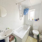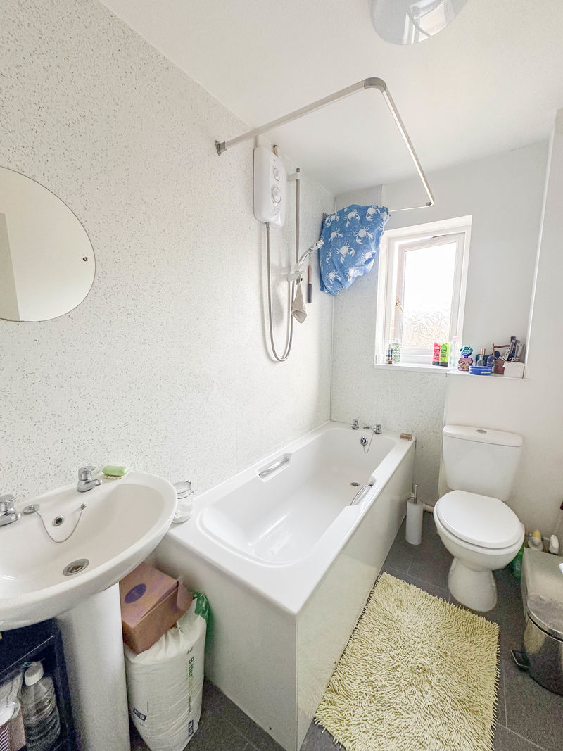Double glazed window, panelled bath with electric shower over, low level WC, pedestal wash hand basin and radiator.
