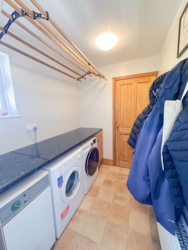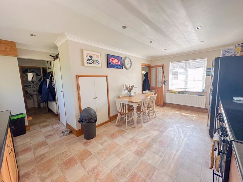 Double glazed windows to front and rear, base cupboards and drawers under a wood work surface, wall cupboards, under stairs storage cupboards, Belfast sink, radiator, space for a fridge/freezer, coved ceiling, space for range cooker, glass splash back, power sockets, opening to utility room and a upvc door to the rear garden.