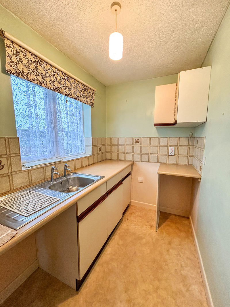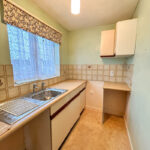 Base units and drawers underneath laminate work surface with wall units above. Inset stainless steel drainer sink and space for a cooker, washing machine and fridge. Double glazed window, power sockets and partly tiled walls.